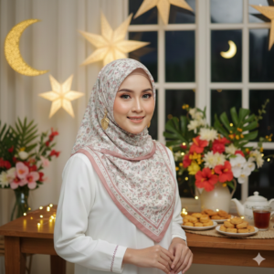 Hijab segi empat tetap menjadi favorit karena mudah dipakai dan cocok untuk berbagai bentuk wajah. Untuk Lebaran 2026, pilih bahan cotton silk atau satin dengan warna pastel lembut seperti dusty pink, mint, atau beige. Padukan dengan dress polos untuk kesan simpel namun elegan.